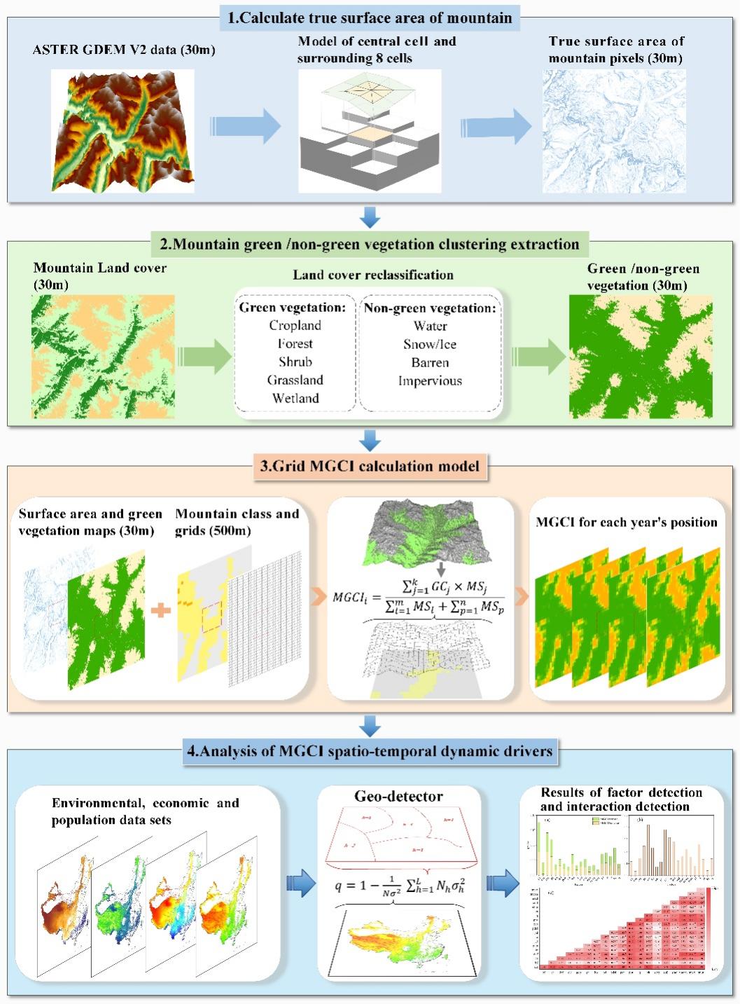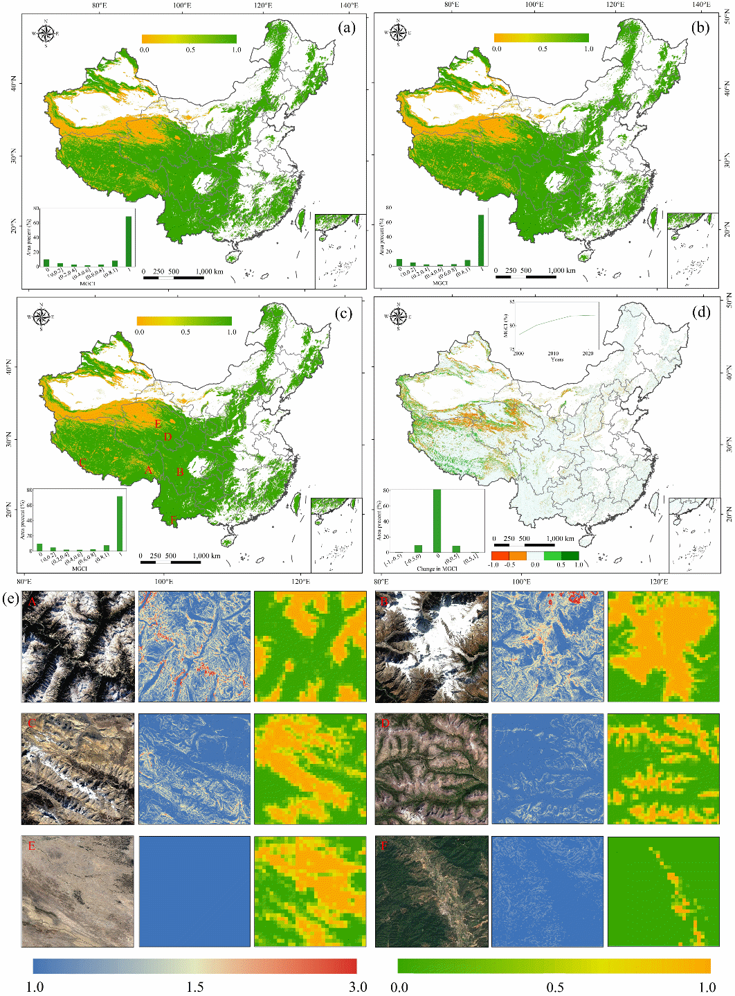 ????团队进一步创新性地构建了首个兼顾山地真实三维曲面特性的SDG15.4.2指标山地绿色覆盖指数(MGCI)估算模型。该模型改变了以往基于平面投影面积计算山地指标的局限,显著提升了评估的准确性?;诖四P停哦幼酆侠枚嘣次佬且8胁酚氲厍虼笫菁际?,成功实现了我国2000至2022年共23年间MGCI的长时间序列、高空间分辨率动态监测。监测结果显示,我国MGCI整体呈现稳定向好趋势,从2000年的78.15%提升至2022年的82.23%,年均增长率为0.18%。团队还深入分析了其时空格局演变规律与驱动机制。研究发现,该指标的改善区与极少量的退化区在空间上呈现异质性分布,且其变化与海拔、水热梯度密切相关。这一数据为联合国2030年议程的中期评估提供了重要的中国案例与数据支撑。